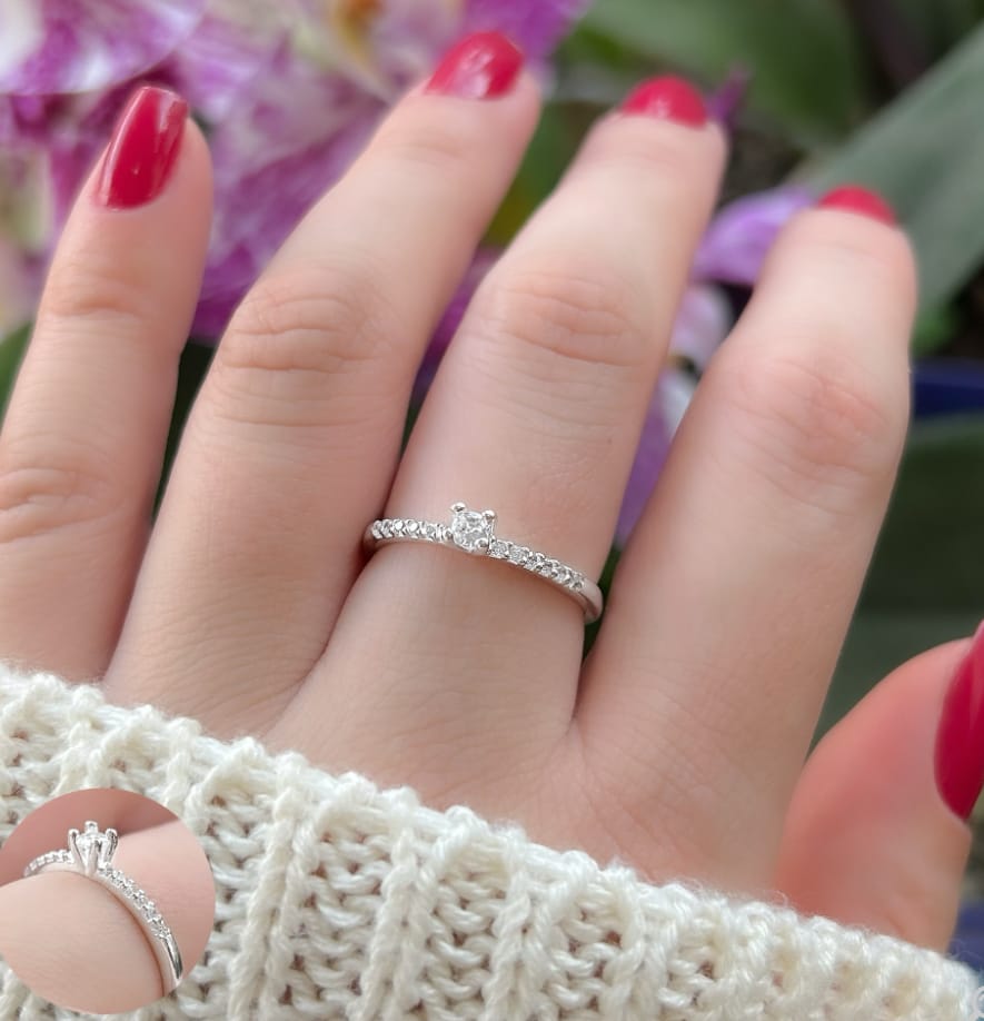 Anel solitário de luxo em prata 925 legítima, com pedra de cristal de alto brilho, envolvido por um refinado design triplamente cravejado que potencializa sua luminosidade. Uma joia imponente, feita para quem valoriza exclusividade e elegância.