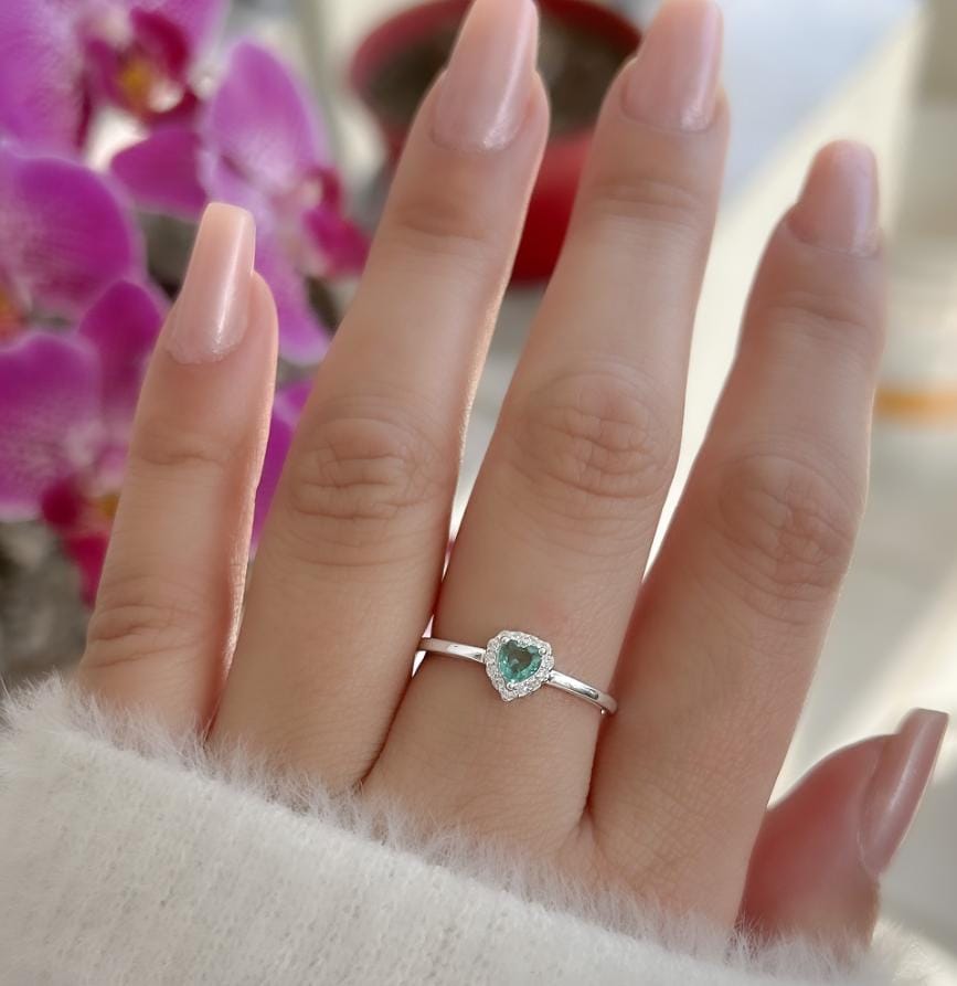 Anel solitário com pedra verde em formato de coração prata 925 legítima, cravejada com pedras cristais, para destacar sua intensidade e brilho. Uma peça sofisticada e romântica, ideal para celebrar o noivado com elegância e significado.