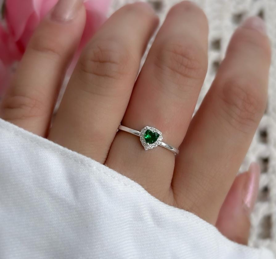 Anel solitário com pedra verde em formato de coração prata 925 legítima, finamente cravejada para destacar sua intensidade e brilho. Uma peça sofisticada e romântica, ideal para celebrar o noivado com elegância e significado.